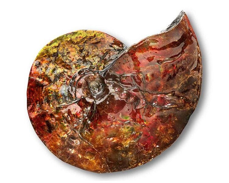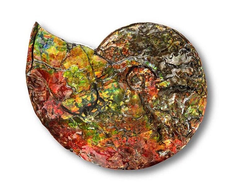 This stunning Ammonite specimen showcases a beautifully preserved shell on both sides. Predominantly red and burgundy hues, the backside also features bright colours including orange, green, gold and a hint of rare blue.